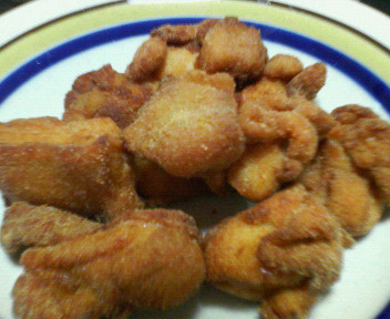 でも食べたいので、フライヤーを購入。 その名も「あげあげ」 あほなネーミングのわりに意外と重宝しております。 で、これが一作目。 よんよんがかき揚げが食べたいと言うので、作りました。 結局どんぶりになってしまったけど。 ちょろっと見えてるのはナスのてんぷら。 あんまりおいしそうに見えない..(泣 これを買ってからというもの、かなりの頻度で揚げ物を作ります。 スタンダードにから揚げも作りましたぁ。 今まで買えなかった冷凍コロッケも買える様になった★ 昨日もから揚げで、オニオンリングも揚げてみました♪ おいしかった。 よんよんは昨日、一生懸命自家製冷凍コロッケを作っていました。 カレーコロッケにしたって言ってたなぁ。 近々食べます♪ |